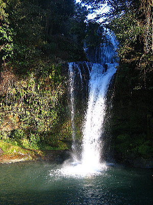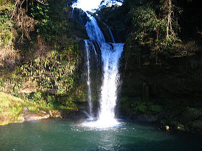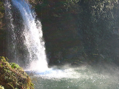 国道210号線沿いにあり、日田市天瀬町と玖珠町の境に位置する二段式滝で、豊かな水が細かいしぶきをたてながら流れ落ちる様が勇壮。別名「裏見の滝」とも呼ばれており、下滝に通っている遊歩道から落下する滝の裏側を見ることもできます。夜間は滝全体が緑色にライトアップされるようです。 |