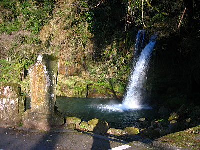 | 滋恩の滝と記された石碑と滋恩の滝。 |
