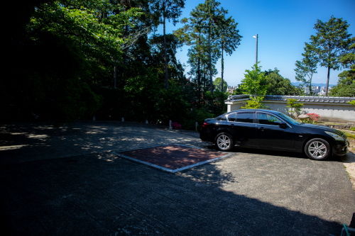 | 駐車場の雰囲気。道幅が狭く勾配がきついので運転に自信がない方や車高が低い車は諦めた方がいいです。 |