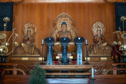| 仏堂。中央に釈迦如来・左脇侍に文殊菩薩・右脇侍に普賢菩薩。 |