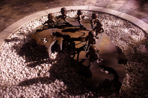 | 鉄道神社境内にあるアート「縁結び七福童子」。 |