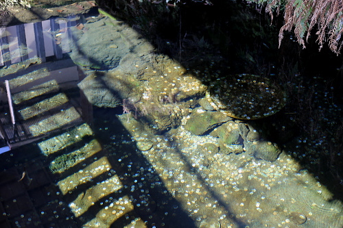 | 鏡ヶ池。池の中には小銭が投げられています。 |