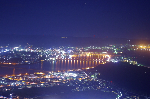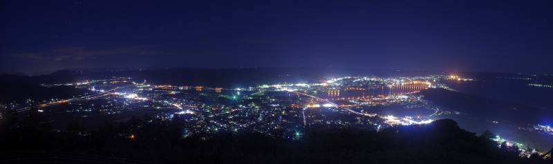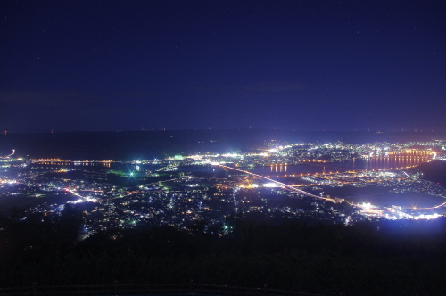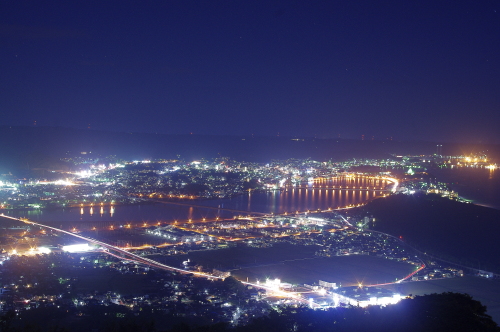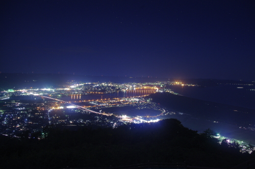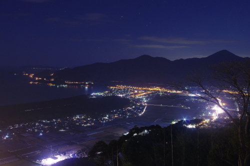 | 佐賀県唐津市にある、標高284mの鏡山展望台からは、唐津市の夜景を一望できるスポットです。展望台には冷たい風を遮る事ができる硝子戸で囲まれた展望スペースもあり、寒い日も快適に眺める事ができます。ただ、駐車場から約5分歩くのですが外灯がない場所もあるので、懐中電灯はあった方が無難です。 |