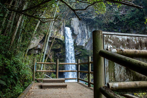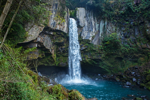 霧島市にある犬飼滝は、霧島山を源流として西南流する中津川(天降川に合流)の中流部にある高さ36m・滝幅22mの滝です。県道沿いには犬飼滝滝見台があるので、この滝見台から眺める事ができますが、迫力ある犬飼滝を見る場合は遊歩道を300m下りて、滝の近くに行けます。奈良末期から平安初期の律令官僚・和気清麻呂が、道鏡の皇位継承を阻んだ怒りを買ってこの地に流され、犬飼滝で遊んでいたとされています。また坂本龍馬も新婚旅行で訪れたとされています。