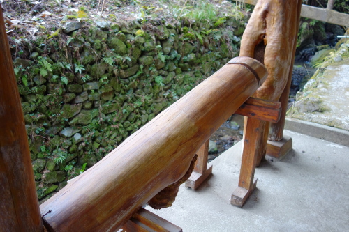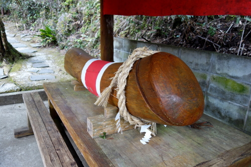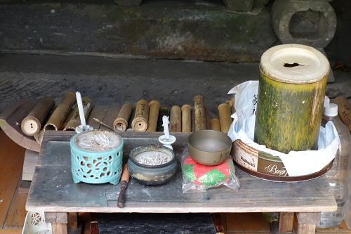| 柳川由布大炊助の墓の前にある火吹き竹。火吹き竹を借りて吹いて耳にあてて参拝します。お礼参りには、新しい火吹き竹を奉納します。 |