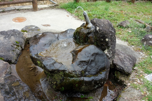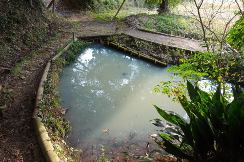 | 足手荒神前の小さな池には「竜神がくれた乳の水」と呼ばれる白い水が湧き出ています。 |