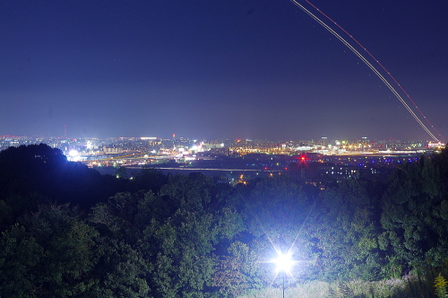 | 福岡空港と離陸する飛行機の光跡を望む。(北北西方向) |