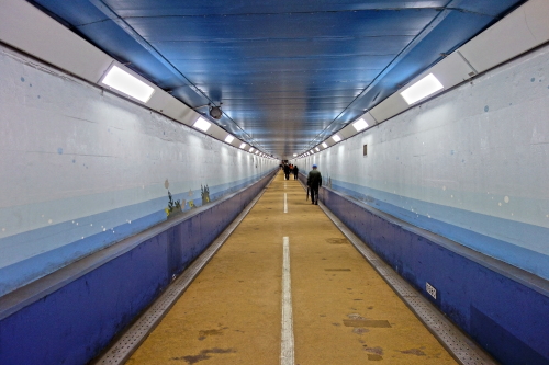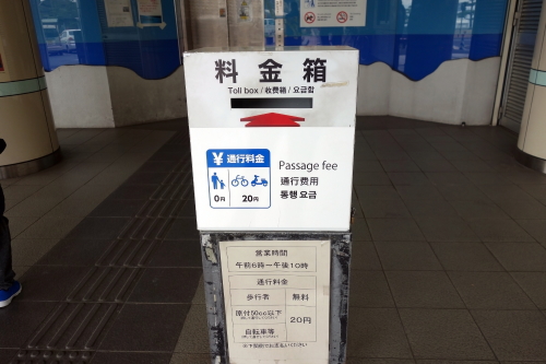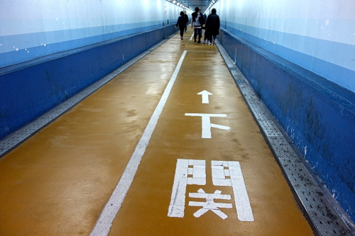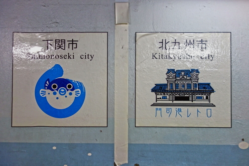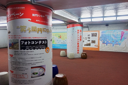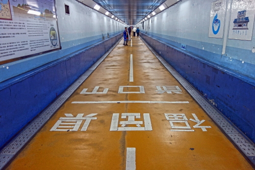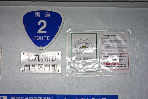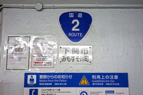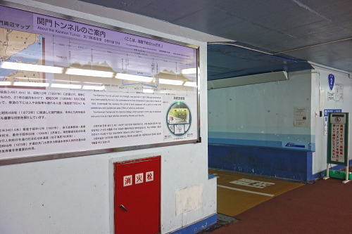 | 関門海峡に通じる関門トンネルは車道と人道のトンネルがあり、人道トンネルは歩行者・自転車・50cc以下の原動機付自転車が利用できる幅4m・長さ約780mのトンネルで、徒歩で約15分ほどで関門海峡の海底を通り抜けることができます。 トンネル内に山口県・福岡県境があり、この県境で記念撮影をする人が多い観光スポットです。また国道2号線の指定になっており、歩行者道路としての国道になっています。その理由から自転車・原動機付自転車は手押しでの通行になります。 通行時間:6時から22時まで 通行料:自転車等20円 歩行者無料 |