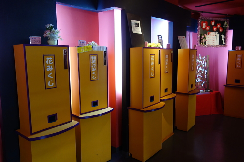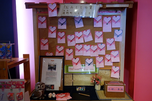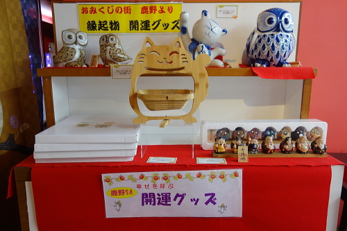 | 中国自動車道のサービスエリアである鹿野サービスエリアは、周南市鹿野町が御神籤日本一の町という事で、おみくじロードと呼ばれるスペースにたくさんの種類の御神籤があります。また縁起物の販売も行われております。鹿野町で作られる御神籤のシェアは9割だそうです。 |
