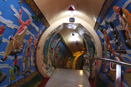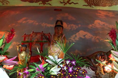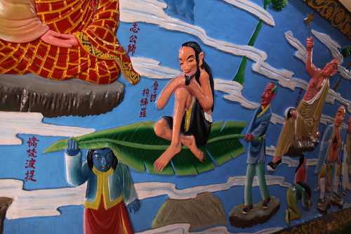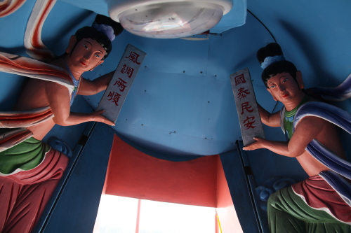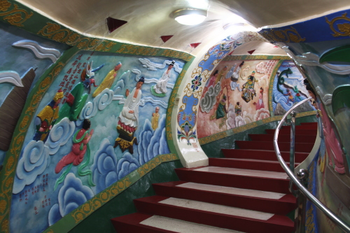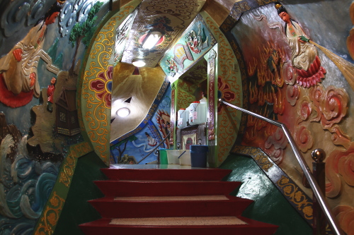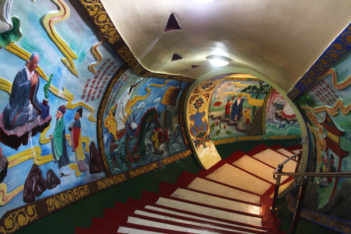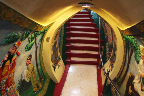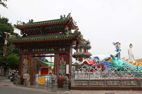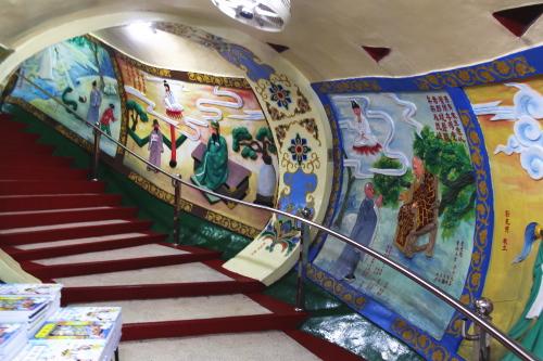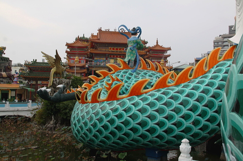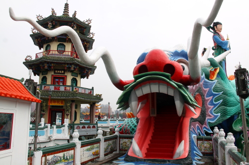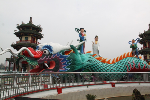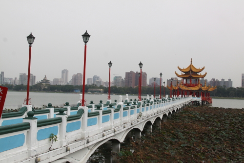 | 春秋閣は目の前にある啓明堂によって1953年に建てられました。九曲橋の両側にあるのが「春閣」と「秋閣」で、この2つを合わせて「春秋閣」と呼ばれています。こちらも龍虎塔と同じように入る順番と出る順番が決まっており向かって左から入って右から出ますが、龍虎塔に比べて龍の体が長いのが特徴です。 |
