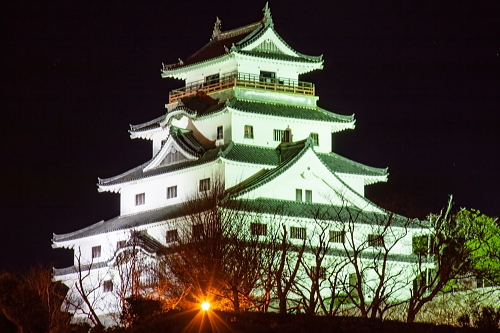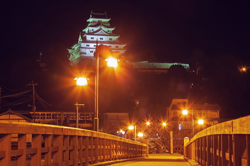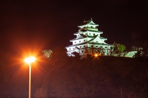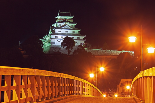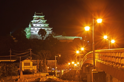 | 唐津市にある唐津城は別名舞鶴城とも呼ばれ、唐津湾にそそぐ河口の左岸にある満島山の山頂にあります。江戸時代に廃城になった名護屋城の遺材を利用し、九州各地の諸大名の助力を得て1608年に完成した城です。しかし天守の存在を示す資料は確認されてなく、現在の天守は慶長期の様式で建築されていたと想定して1966年に造られたもので唐津のシンボルになっています。夜間になるとライトアップされ、暗闇に浮かんだように見えます。 |