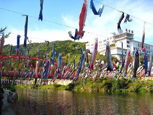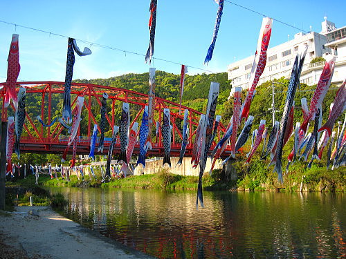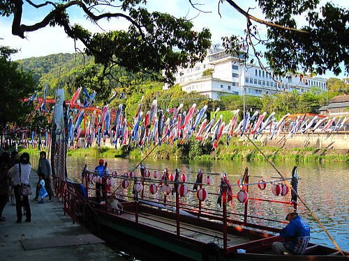 | 官人橋と鯉のぼり。背後の建物は竜登園です。 |