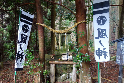 | 八女市矢部村の国道442号線から入り込んだ山間に風神宮があります。風神宮は綾部八幡由来風の神が祀られており、風水害の難を避け、何人皆和やかに無病息災守護安心を語り継いでいます。道から徒歩で200mの山道を登ります。鳥居もちょっと変わった感じで、鳥居の側には山水を頂けるようになっています。 |