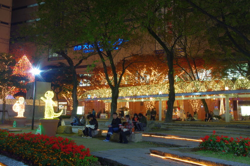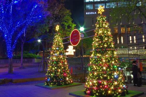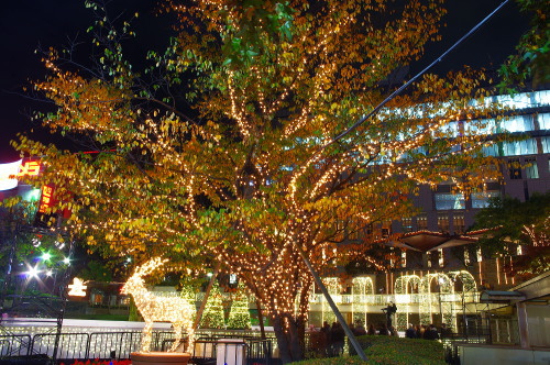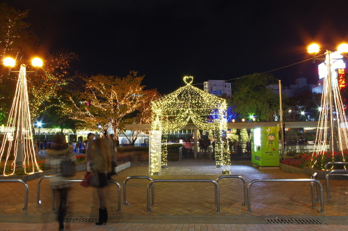 | 福岡の商業中心地・天神にある公園・警固公園では、池の上に浮かんだモニュメントなど、規模としては一番大きいクリスマスイルミネーションです。訪れる人も一番多く、カメラで撮影する人やイルミネーションを見に来ている人などで賑わいます。 |