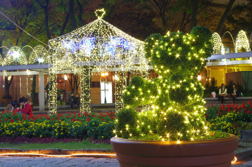 | 警固公園のイルミネーションとクマのモニュメント。 |