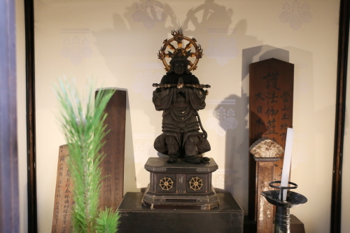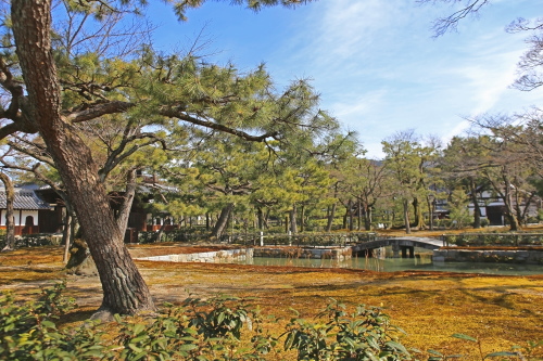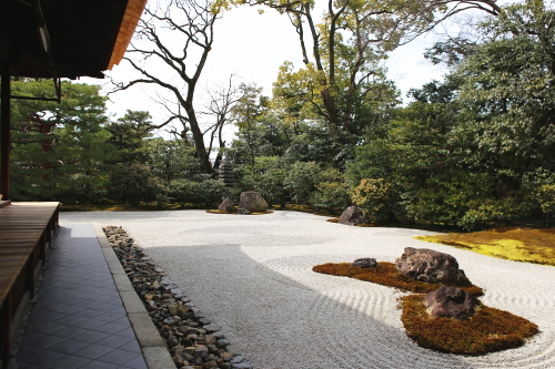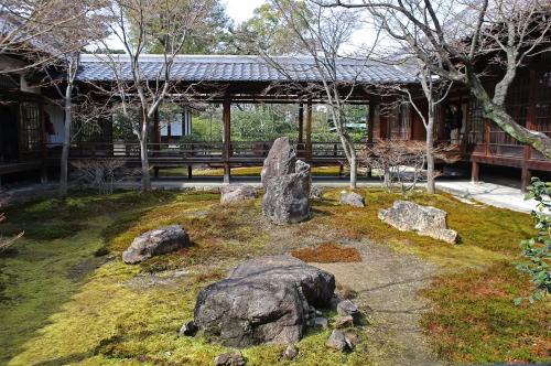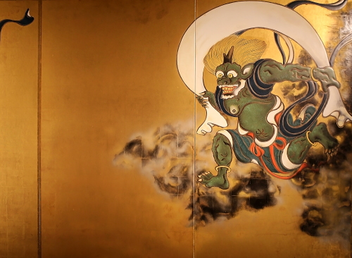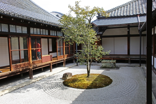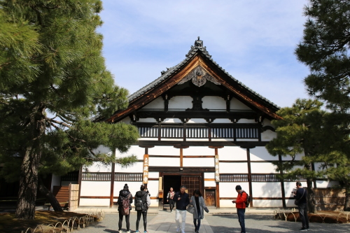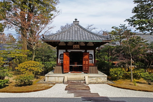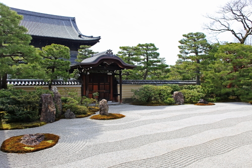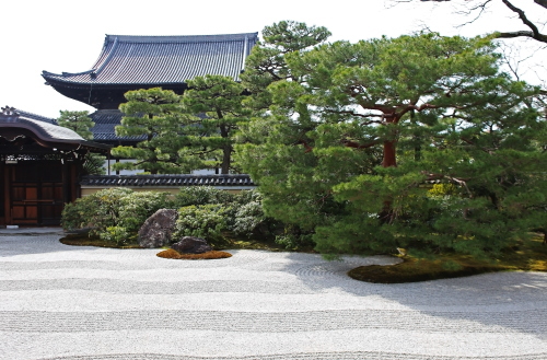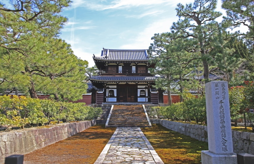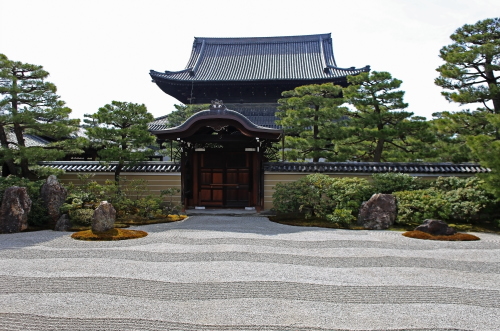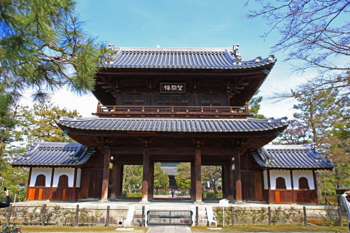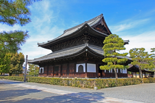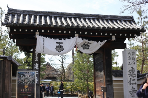 建仁寺は鎌倉時代である1202年に、将軍源頼家が寺域を寄進し栄西禅師を開山として、宋国百丈山を模して建立された寺で京都五山の第3位に列しています。山号は東山と号し本尊は釈迦如来です。俵屋宗達の「風神雷神図」、海北友松の襖絵などの文化財を豊富に伝える寺であり、桃山時代の池泉回遊式庭園で有名です。また、豊臣秀吉を祀る高台寺や「八坂の塔」のある法観寺は建仁寺の末寺でもあります。