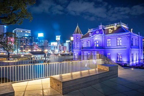 | 九州最大の繁華街である福岡市中央区天神にある天神中央公園に旧福岡県公会堂貴賓館があります。1910年に開催された第13回九州沖縄八県連合共進会の来賓接待所として使用する為に建てられたもので、木造2階建・フレンチ・ルネッサンス様式のデザインが取り入れられた建築物で、設計は福岡県の土木技師として活躍していた三條栄三郎によるものです。夜間になるとライトアップされ、その時期によってはカラフルなライトアップも行われます。この旧福岡県公会堂貴賓館は1984年に国の重要文化財に登録されました。2017年にリニューアルオープンされ、館内にはカフェを新設しレトロ衣装のレンタル等も行われています。同時に天神中央公園も整備されて明るい公園に変わりました。 令和2年11月12日から11月25日は「女性に対する暴力をなくす運動」期間という事で旧福岡県公会堂貴賓館はパープル・ライトアップを実施されました。 【駐車場】近隣に多数コインパーキング有 |