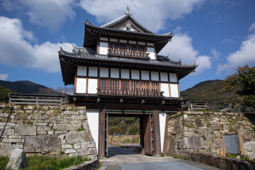 文化10年(1813年)に火災でこの大手門櫓は焼失し、文化14年(1817年)二重櫓門を再建されましたが、老朽化により大正8年(1919年)に解体された後、平成2年(1990年)に万松院宗家文庫に保存されていた模型を基に、旧厳原町の “平成の城下町づくり事業”の核として、古写真や模型などに基づき木造によって二重の櫓門が再び復元され、現在では記念公園として整備されています。 |