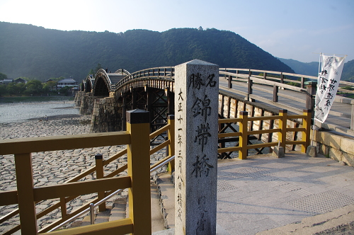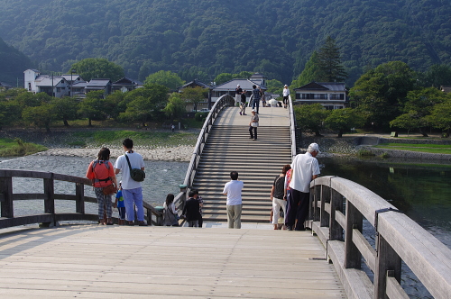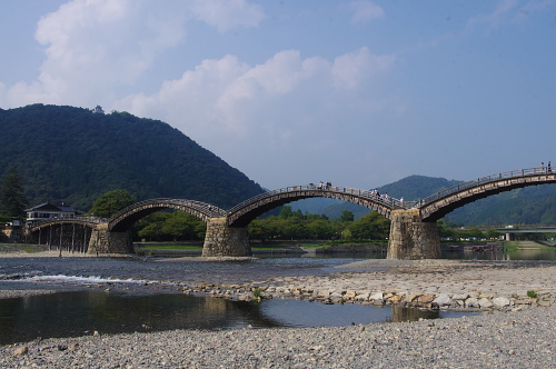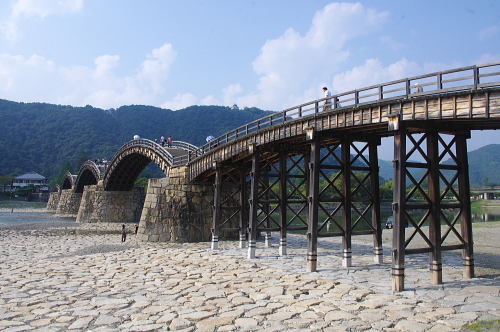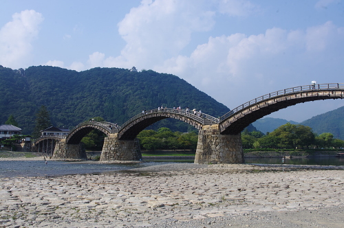 | 岩国市を代表する観光地である錦帯橋は、岩国市を流れる錦川に架かる、5連のアーチからなる木像のアーチ橋で、日本三名橋・日本三大奇橋の一つに数えられており、1922年に名勝に指定されています。 全長193.3m・幅5.0mで継手や仕口といった組木の技術で作られており、中国・杭州に架かるアーチ型の橋をヒントを得て1673年に創建されたもので、1674年に流失・再建し1950年に台風で崩れてしまいましたが、1953年に再建した後2004年に架け替え工事が行われています。 |