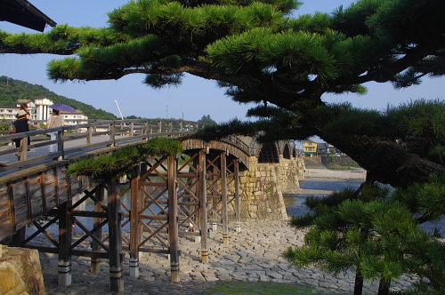| 錦川に架かる錦帯橋と、山の上に建つ岩国城を眺める。 |