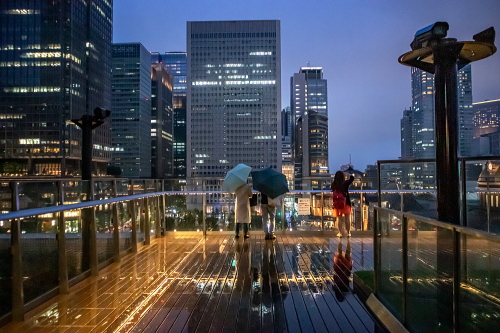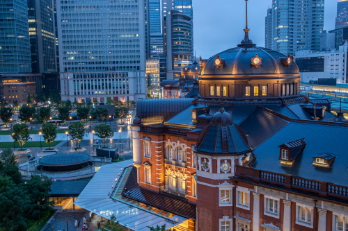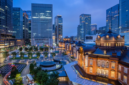 | 日没頃の丸の内の高層ビルと丸の内駅前広場。 |