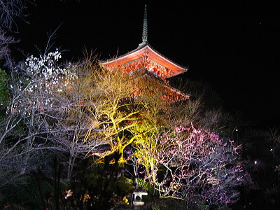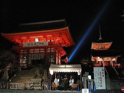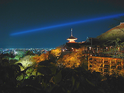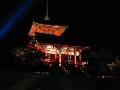 | 西国33ヶ所観音霊場の第16番札所である清水寺は「清水の舞台」であまりにも有名です。国宝本堂などが浮かび上がり、京都の夜景も観賞できます。 |
