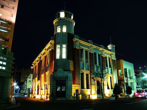 | ライトアップされた旧古河鉱業若松ビル。 |