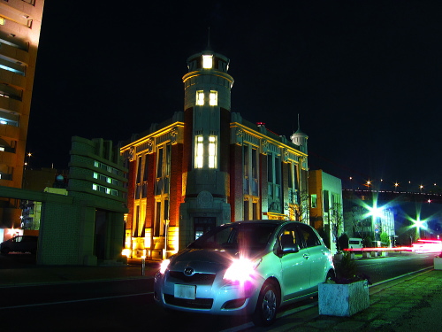 | 若松桟橋近くにある旧古河鉱業若松ビルは、大正8年に建築された2階建ての建築物で、大正ロマンの雰囲気を持つ多目的ホールとして活用されています。平成2年には歴史的建造物として、北九州市建築文化賞を受賞し、この付近の南海岸通りは都市景観整備地区に指定されて、平成15年には改修工事され、翌年に開館されました。夜になるとライトアップされ、神秘的な雰囲気になります。 |