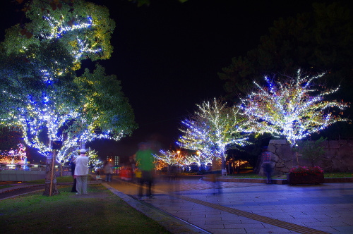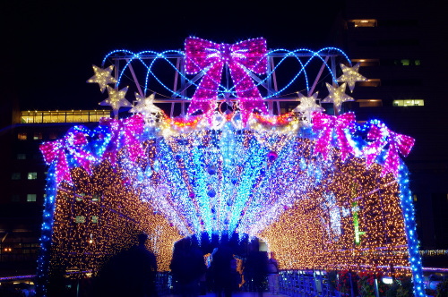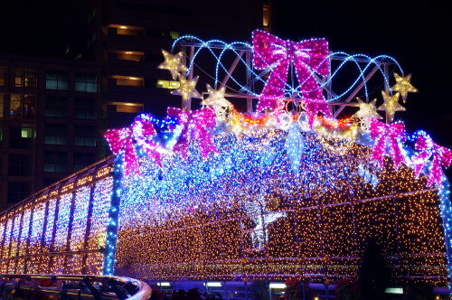 | 毎年11月に開催される小倉イルミネーションは、様々なイルミネーションが小倉中心部を照らしてくれます。会場は大まかにJR小倉駅周辺エリアと、紫川周辺エリアと分けられ、様々なイルミネーションで見る人を楽しませてくれます。小倉井筒屋では、新館の北口にイルミネーションが点灯し、リバーウォーク側に流れる紫川に架かる橋・鴎外橋にもイルミネーションが点灯されます。 |