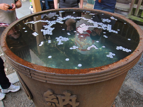 | 水の上に1円玉を浮かせるものらしい。旭社前にて。 |