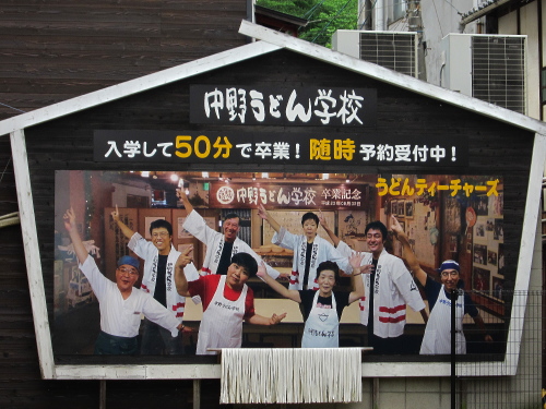 | 中野うどん学校の看板。入学して50分で卒業だそうです。 |
