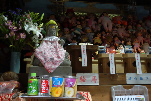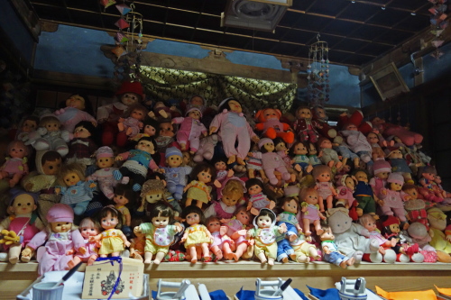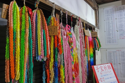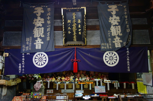 | 篠栗四国霊場・55番の桐ノ木谷大日堂手前にある桐ノ木谷子安観音は、子供の安産祈願や子宝祈願に信仰がある観音堂です。子安観音の歴史は約160年で霊感あらかな観音堂です。お参りに行ったら人形を1体選び頂いて帰り、家では本当の子供のように大事に扱わないといけません。お礼参りをする際には、「頂いた人形」と「新しい人形」の2体を納めるようになっています。その為、観音堂には沢山の人形が置かれています。参道は125段の階段を上がって行きますが、急な階段なので無理せず上った方がいいでしょう。ここまでの道のりは道幅が狭いので、車での通行には注意が必要です。 御本尊:子安観世音 |
