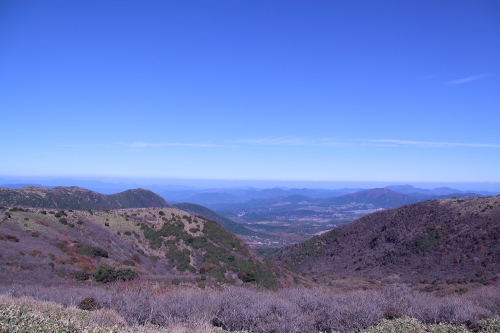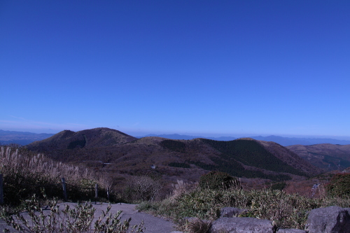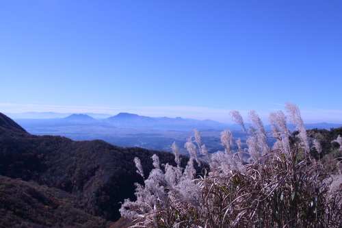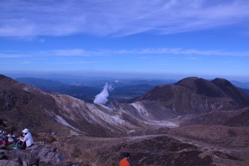 | 山頂から久住高原と遠くに阿蘇山を眺める。 |