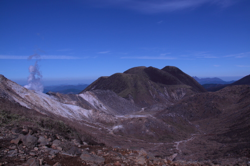 | 登山道から北千里浜と硫黄山の噴煙を眺める。 |