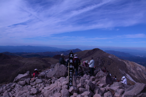 | 久住山は、大分県竹田市にある標高1787mの日本の百名山で、九重連山を形成する火山です。登山をするには、最短で久住山の西側にある牧ノ戸峠から登り始めます。きちんと整備された登山道がありますが、道のりはかなり厳しいところもあるので、楽に登山はできませんが、登山道や久住山頂からの景色はすばらしいものがあります。 |