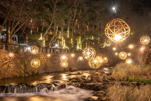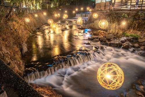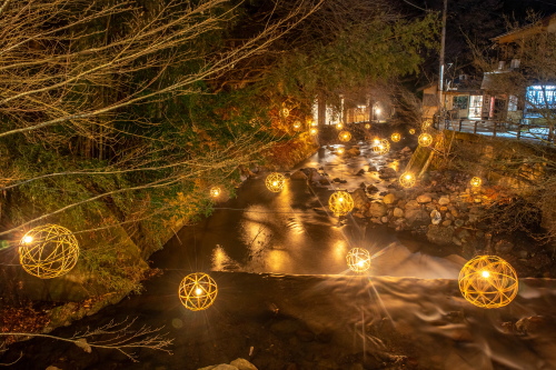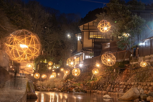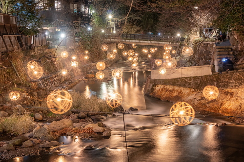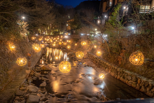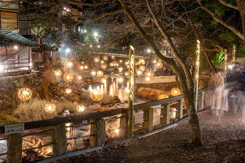 湯あかり」は竹の明かりが揺らめく幻想的な空間を演出しており、今では黒川温泉の冬の風物詩となっています。 球体状の「鞠灯篭」約500個と、筒状で高さ2mほどの「筒灯篭」を、自然の景観に溶け込むように配置して、日暮れから22時まで点灯されています。 日程:毎年12月中旬頃〜翌年5月頃迄 時間:日暮れ〜22:00 ※ 平野台展望所は時間の制限有 12/19〜3/31 …日の出 5:00〜8:00/日の入 17:00〜20:00 4/1〜5/30 …日の出 4:00〜7:00/日の入 18:00〜21:00 場所:丸鈴橋~川端通り・やまびこ旅館付近・地蔵堂・旅館組合 黒川温泉バス停・黒川温泉明神様・平野台展望所 黒川温泉サイトはこちら |