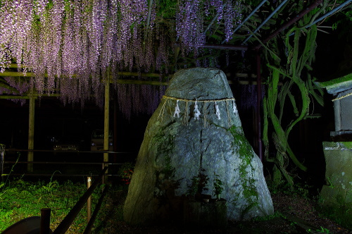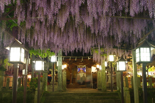 | 八女に黒木町にある黒木の大藤は、応永2年(1395年)に後征西将軍良成親王の手により植樹されたとされている樹齢600年以上にもなる藤の木があり、国の天然記念物にも指定されています。毎年藤の花が咲くゴールデンウィーク時の夜にはライトアップされ、素盞鳴神社内の3000平方メートルの藤棚に藤の花が一層引き立ちます。また藤の花の香りが境内に広がっていて、眼と鼻を楽しませてくれます。 |