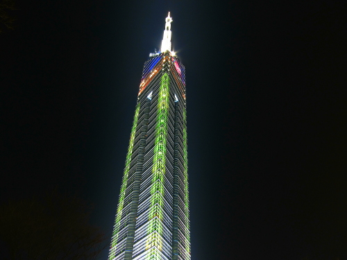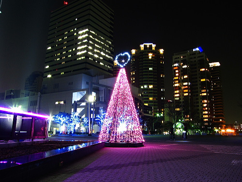 | ピンクのツリーイルミネーションと高層マンション群を望む。 |