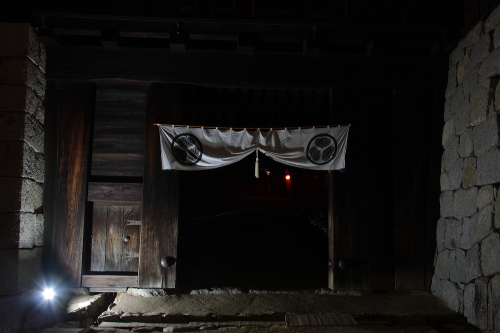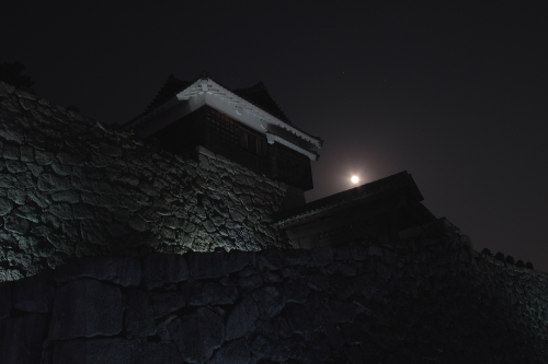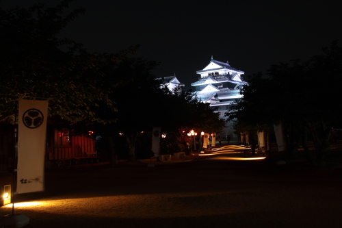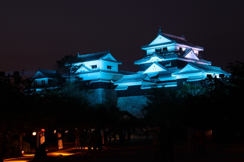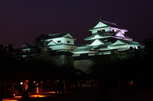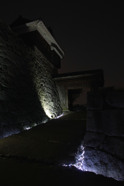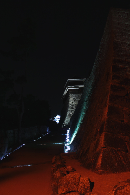 | 石垣のライトアップと松山城本丸ライトアップ。 |