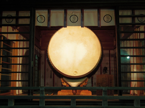 | 大鈴の向かい側には直径2.2mの日本一の大太鼓が奉納されています。 |
