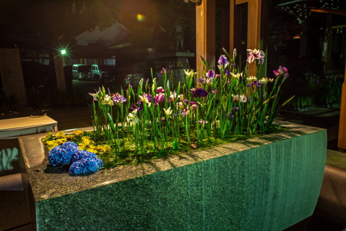 | 手水舎には菖蒲と紫陽花が飾られていました。 |