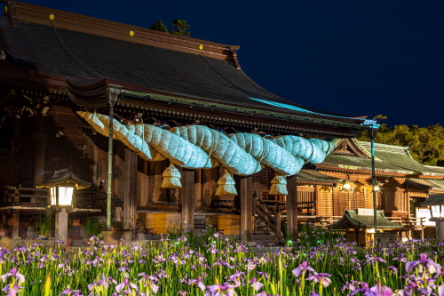 | 福津市にある開運商売繁盛の神様である「神功皇后」「勝村大神」「勝頼大神」を御祭神として祀る宮地嶽神社は全国にある宮地嶽神社の総本社であり、参拝客が多い神社です。毎年5月下旬から6月上旬までの期間は江戸菖蒲園と江戸菖蒲を拝殿前に移設して、菖蒲まつりとして訪れる人々の目を楽しませてくれます。夜間はライトアップされ。昼間とは違った雰囲気で楽しむ事ができます。令和3年から拝殿に吊り下げられている日本一の注連縄に映像を投射する「プロジェクションマッピング」が行われました。 |