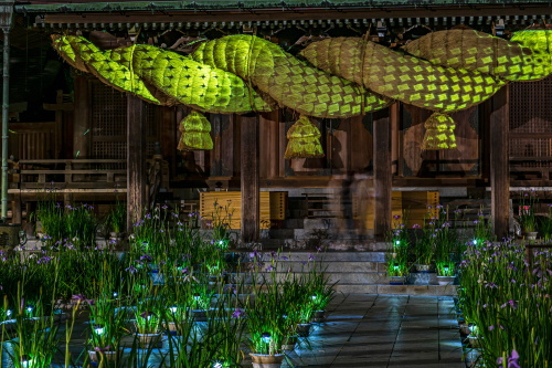 | ライトアップされた菖蒲と拝殿。 |