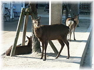 | 奈良と同じく鹿が放し飼いになっており、あちらこち らで見る事ができます。 |