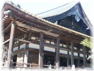| 五重塔の隣にある千畳閣。 豊臣秀吉が毎月一度、千部経の転読供養をするた めに天正15年(1587)発願し、安国寺恵瓊を奉行と して着手させました。 西降棟の鬼瓦には天正17年 の銘文があります。 この建物は桁行正面13間、背面15間、梁間8間、 素朴単層で屋根は本瓦葺入り母屋造りの大伽藍 です。 着工以来10年余、秀吉の死(1598)によって完成を みないまま今日におよんでいます。天井が張ってな く、小屋組が見えたり、また正面縁側が切り込みに なって床に竹のすの子張りのところがありますが、 これは正面入口がつけられるはずで完成しておれ ばさぞ豪華なものであったろうとおしまれます。 (全部畳を敷けば857畳)。 |