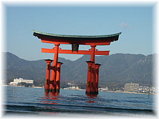 | 厳島神社の朱丹の大鳥居は、観光日本のシンボ ルとして外国にも広く知られています。この鳥居の 形式は、四脚造りで、楠の自然木を使った典型的 なものです。平安時代の記録では、鳥居はあった ことになっていますが、形式はどのようであったか わかりません。今の鳥居は平安時代から8代目で 、明治7年10月17日に建立にかかり、明治8年7 月に完成したものです。主柱の用材は九州宮崎県 と四国香川県から選び、総高53.3尺(約16m)、 主柱の高さ44.5尺(約 13.4m)、主柱のまわり 33尺(9.9m)、棟の長さ77.8尺(23.3m)、本 社の拝殿より108間、火焼前より88間の海面に、 自然の重みで立っています。 |