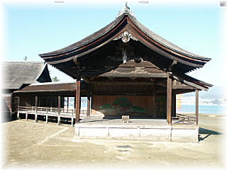 | 国重要文化財・能舞台。 桁行1間、梁間1間、一重切妻造り、妻正面、桧皮 葺の能舞台は、海上に建っているため、通常能舞 台の床下に置かれている共鳴させるための甕がな く、床は響きをよくするため一枚の板のようになって います。 床板は間隔を広くとった根太(床板を受け る横木)と井桁に組まれた大引(根太を受ける板)の 上に置かれているため、床が太鼓の皮のような役 割を果たし、足拍子のたびに大きく共鳴して響きま す。また、潮の満ち引きによって響きの音色が変わ るのも、全国で唯一の海に浮かぶ能舞台ならでは といえます。 |