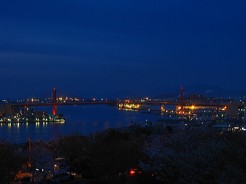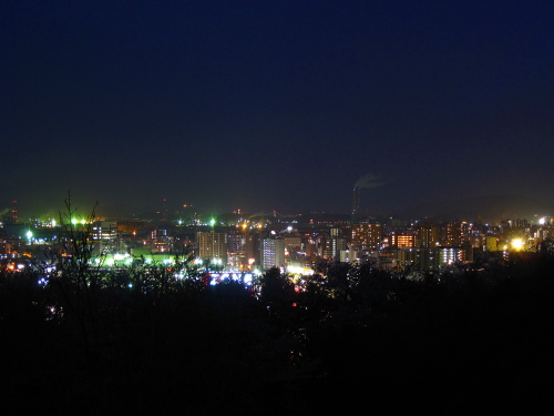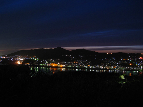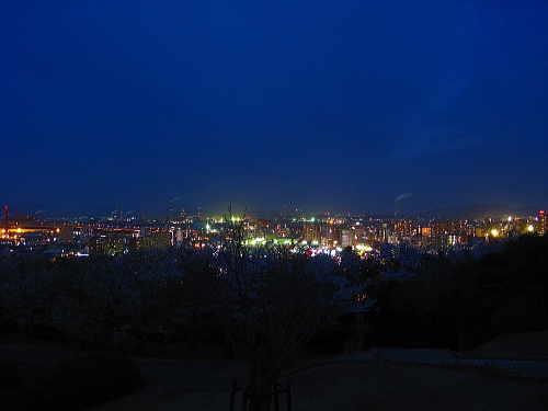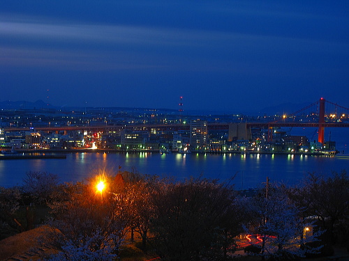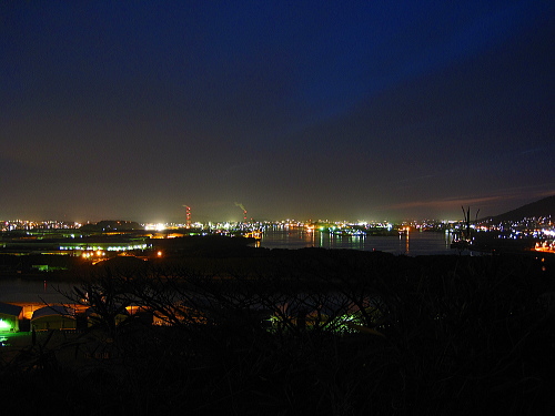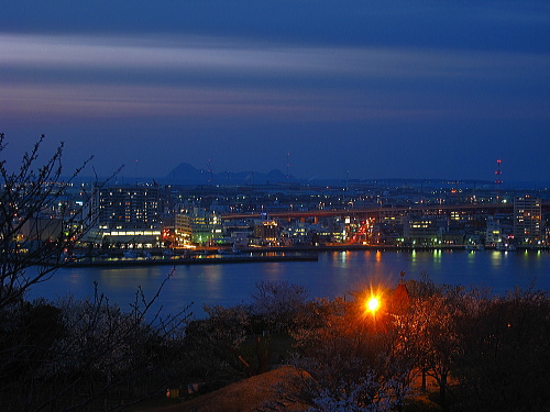 | 北九州市戸畑区の南にある小高い丘に公園はあります。公園内には2ヶ所の展望台があり、東から戸畑市街・若戸大橋・若松市街・洞海湾・八幡市街と広範囲で夜景を観賞できます。標高が低いので迫力はなく、見える光量は少なめですが、雰囲気に優れており、落ち着いて夜景を鑑賞できるスポットとなっています。 |