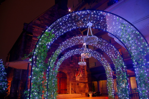 | 梅田地下街から行けるホテルモントレ大阪では、12月になると8階の屋上広場・エンジェルプラッツ前パティオがイルミネーションの光で飾られます。シンプルなイルミネーションですが、結婚式場でもあるので雰囲気は非常によく、また思ったより人が少ないので気兼ねなくイルミネーションを楽しめます。 |