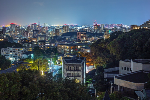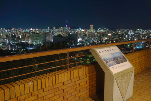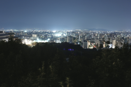 | 福岡市天神から車で約15分くらいにあるこの公園の西側離れ・山の上ホテルの手前側に展望台があり、福岡市の東は天神から西は西区・姪浜地区・南は南区西部までの約270度の視界でパノラマ夜景が楽しめます。油山より市街地が近く・高度差はないですが、綺麗な夜景を眺めることが出来ます。 展望台も綺麗に整備されており、外灯もあるので懐中電灯は不要です。駐車場が夜間は閉鎖されているので、近くの駐車場に止めて徒歩で来る事になります(徒歩約5分弱)。 |